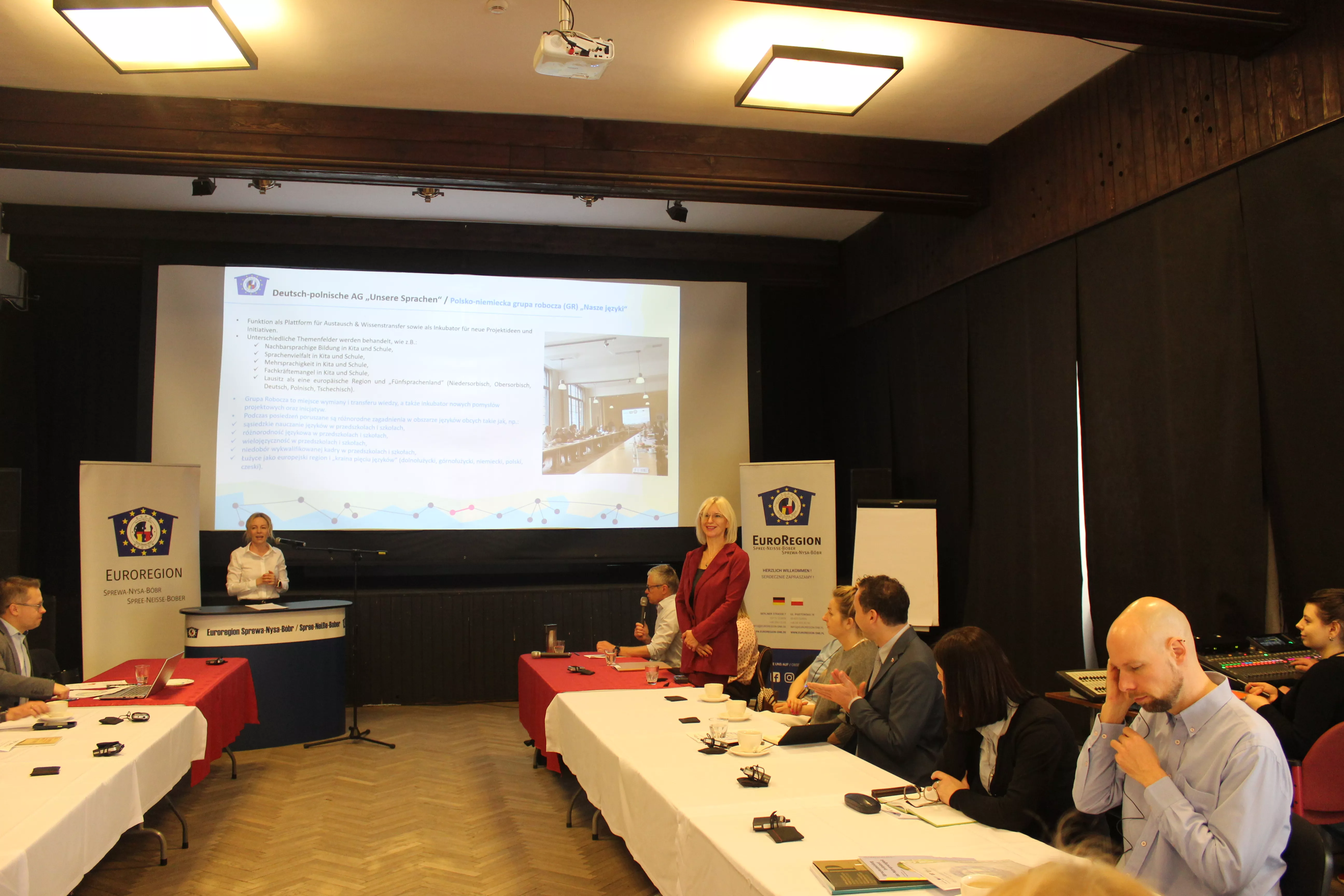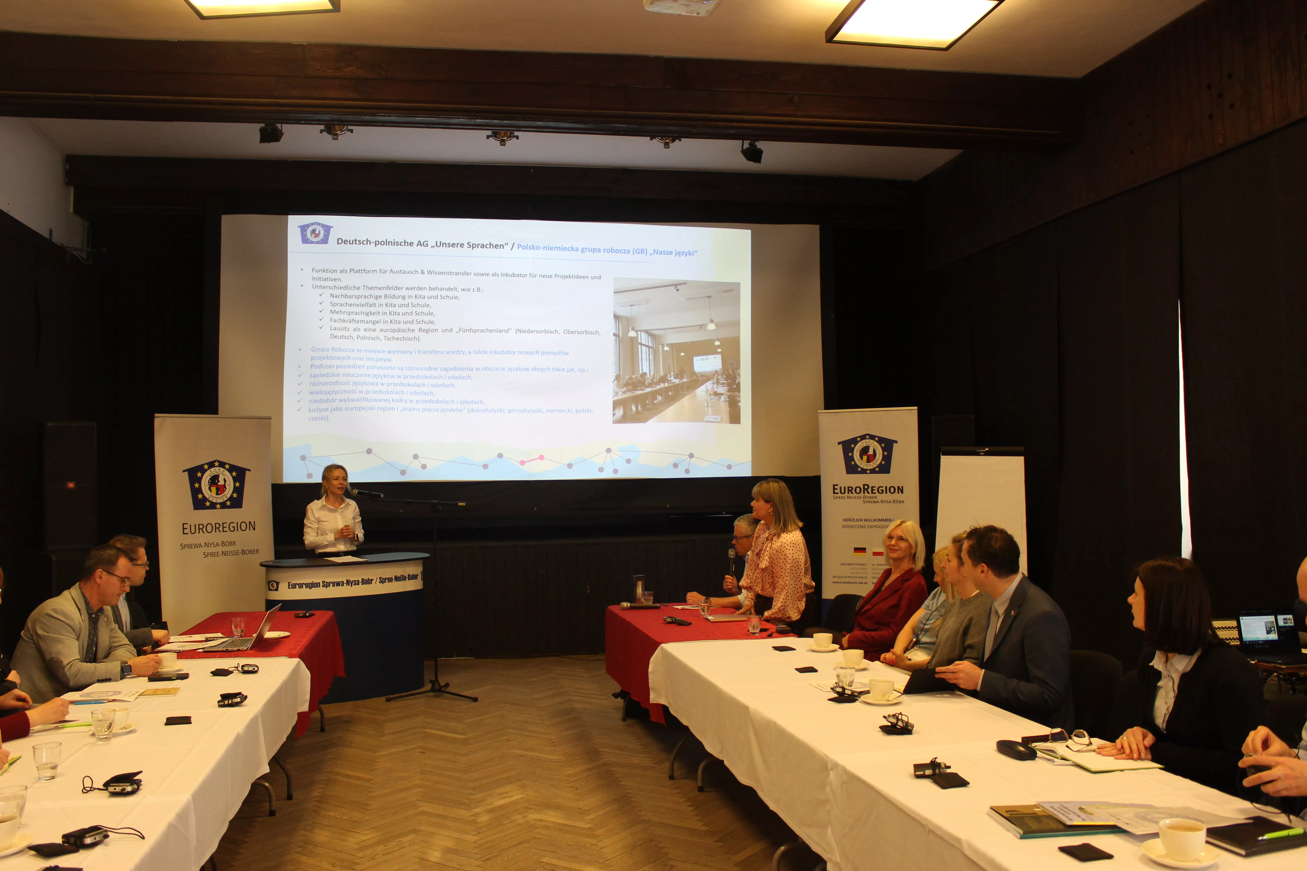 Po otwarciu posiedzenia przez Dyrektor polskiego biura Euroregionu, Panią Izabelę Pantkowską, każdy z uczestników miał okazję się przedstawić i opowiedzieć, kiedy i w jakich okolicznościach miał swój pierwszy kontakt z językiem sąsiada.